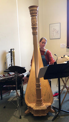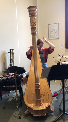 The harp is a highly visual instrument, with the connection between harp and harpist as direct as possible, with no intermediary mouthpiece or bow between musician and string, where the sound is created. The setup for The Crown of Ariadne already provides the audience with a visual claustrophobia, as the harp is “trapped in a cage of percussion.”[5] This obscures the view of the harpist – just as Ariadne is obscured in popular culture and literature. This suite presents a different angle of the character and allows audience members to create their own picture of Ariadne and re-examine preconceived notions. The performer treats Crown as a theatrical piece, such as Stockhausen Harlekin (for dancing clarinettist) or Folke Rabe Basta for solo trombone. In these pieces movement is used to aid and enhance audience perception, and the performer approaches the piece as an actor and dancer in addition to their primary role as musician.