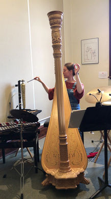 Timpanic sounds – one hand strikes the sound board in the most resonant part while the other plays the notated pitch. These should blend together to create one sound (i.e. Ariadne’s Dance)